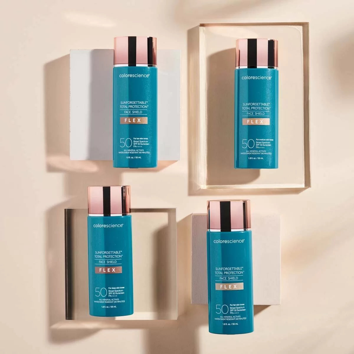 Το Sunforgettable® Total Protection™ Face Shield Flex SPF 50 διαθέτει καινοτόμες εγκλεισμένες χρωστικές μέσα στη λευκή αντηλιακή βάση. Αυτές οι μικροσκοπικές «νιφάδες» χρώματος ενεργοποιούνται καθώς τρίβετε απαλά το προϊόν στο δέρμα. Έτσι, η αρχικά λευκή φόρμουλα μεταμορφώνεται και προσαρμόζεται στον φυσικό τόνο και τα υποτόνια της επιδερμίδας σας.